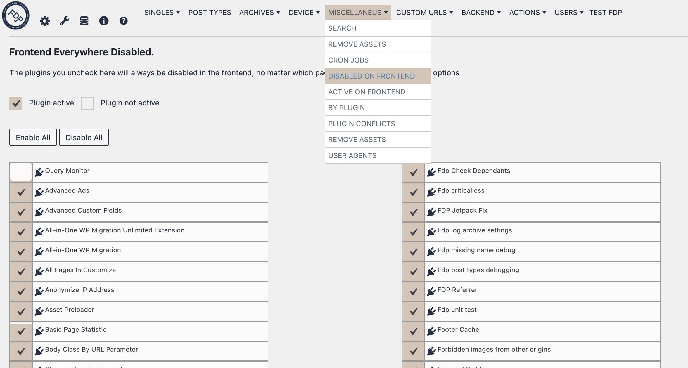 - ☐ Identify which plugins can be safely disabled site-wide on the frontend (e.g., backup plugins)